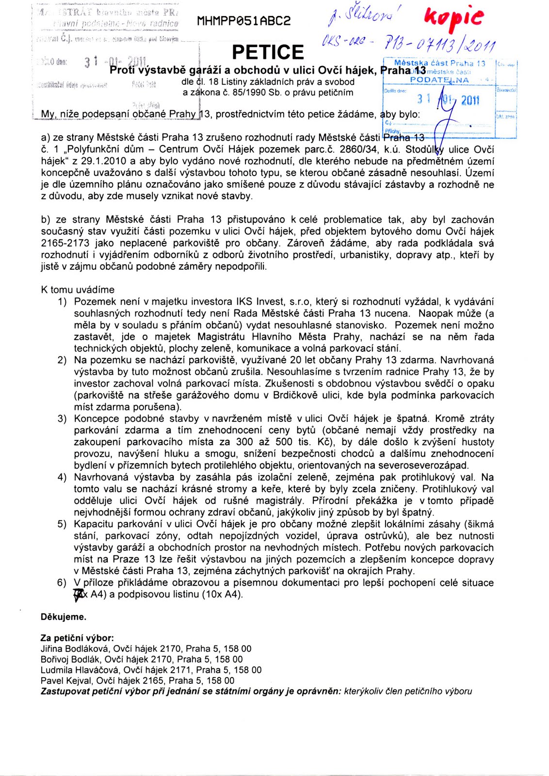 Usnesením rady 383/2011 Prahy 13 bylo zrušeno původní rozhodnutí z roku 2010. Rada nám tedy dala za pravdu a nesouhlasí se záměrem zde stavět.